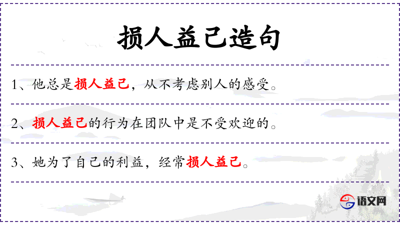 - 宾语:无直接宾语,但“损人益己”中的“损人”和“益己”可以视为间接宾语和直接宾语。