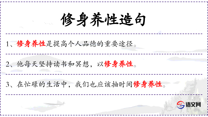 - 修身养性:成语,表示通过学*和修养来提高个人的品德和素养。