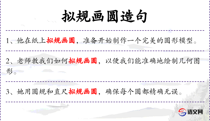- 拟规画圆:动词短语,表示绘制规则的圆形,可能指绘图技巧的练*。