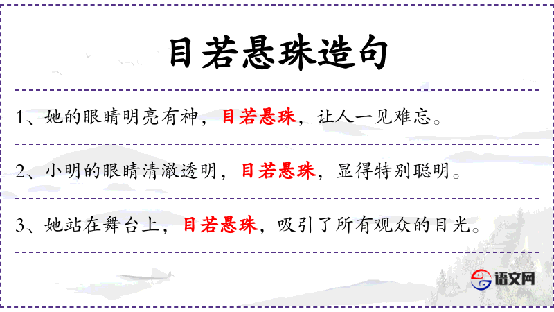 2. 【目若悬珠】 - 眼睛象一对悬挂的珠子。形容眼睛明亮有光彩。