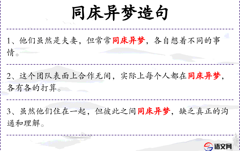 - “同床异梦”是一个**成语,源自《左传·僖公二十五年》,用来形容夫妻或伙伴表面上在一起,实际上各有各的心思。