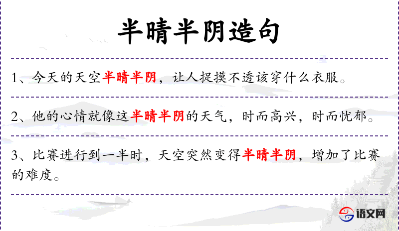 - 半晴半阴:形容天空状况不稳定,既有晴朗的部分也有阴云的部分。