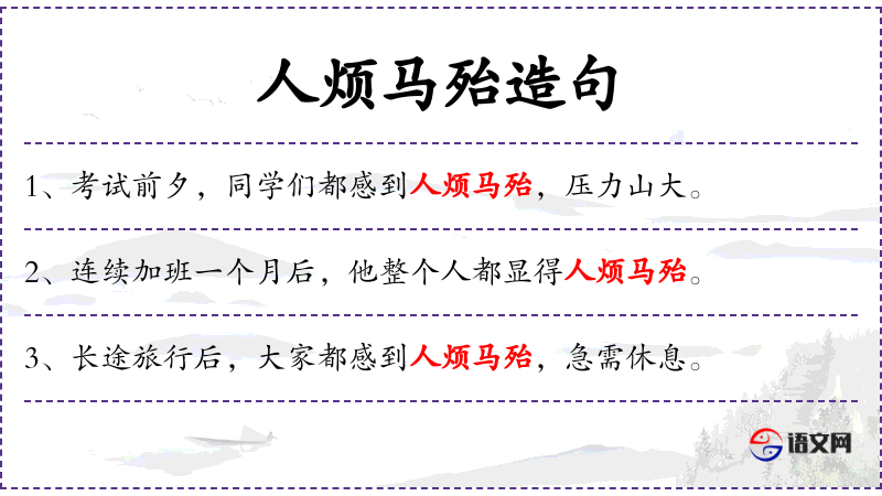 - 人烦马殆:这个成语源自古代,形容人非常疲倦,类似于现代汉语中的“筋疲力尽”。
