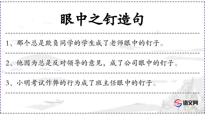5. 【钉子】 - 金属制成的细棍形的物件,一端有扁平的头,另一端尖锐,主要起固定或连接作用,也可以用来悬挂物品或做别的用处; 比喻难以处置或解决的事物~户; 比喻埋伏的人安插~。