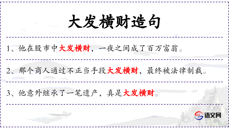 1. 【大发横财】 横:意外的。用非法的手段谋取大量钱财。有时也指意外地发了财。