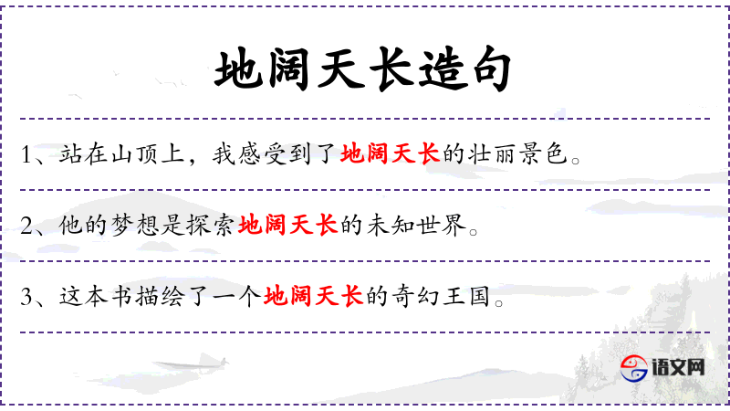 - 同义词扩展:“地阔天长”可替换为“广袤无垠”、“辽阔”等;“自然美景”可替换为“自然风光”、“自然景观”等。