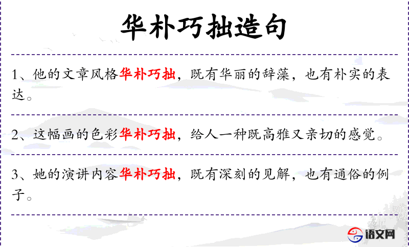 1. 【华朴巧拙】 华丽、朴实、奇巧、古拙。指各种不同的文风。