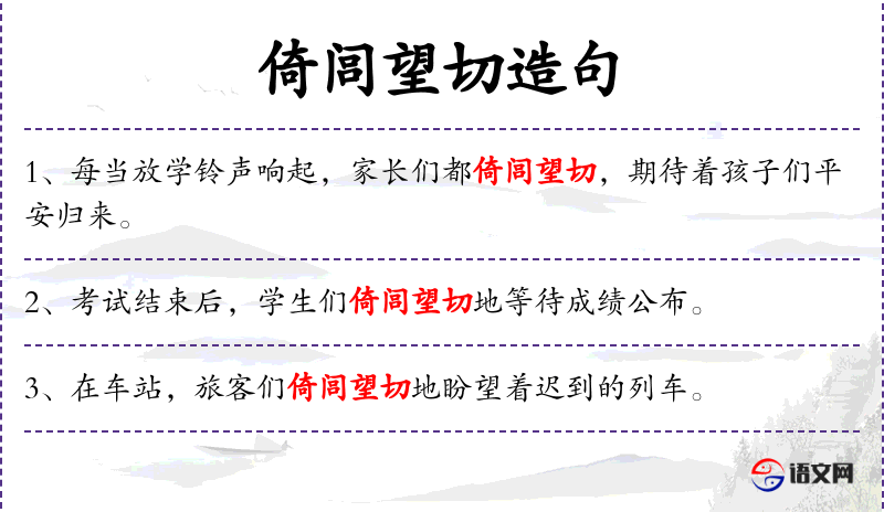 - 倚闾望切地:倚闾(yǐ lǘ)指靠着门框,望切表示非常急切地盼望。
