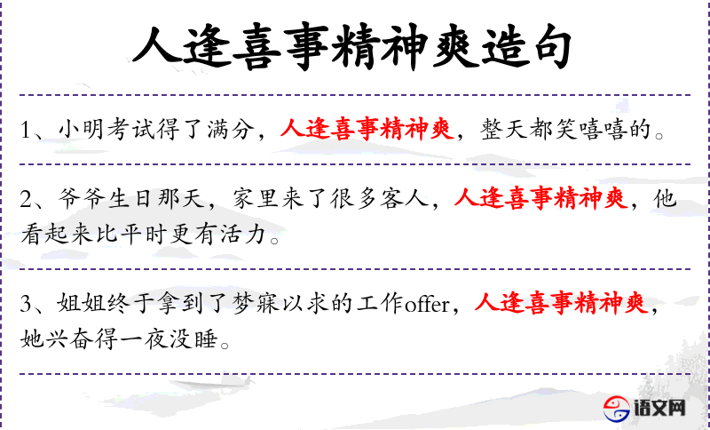 句子中的“人逢喜事精神爽”是一个成语,反映了文化中对喜事的积极态度和对精神状态的重视。