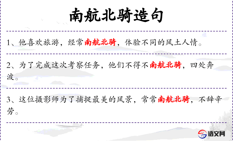 - 南航北骑:字面意思是向南航行,向北骑行,这里比喻四处奔波
