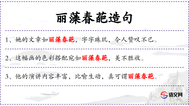 - 丽藻春葩:成语,比喻美丽的文采或事物。