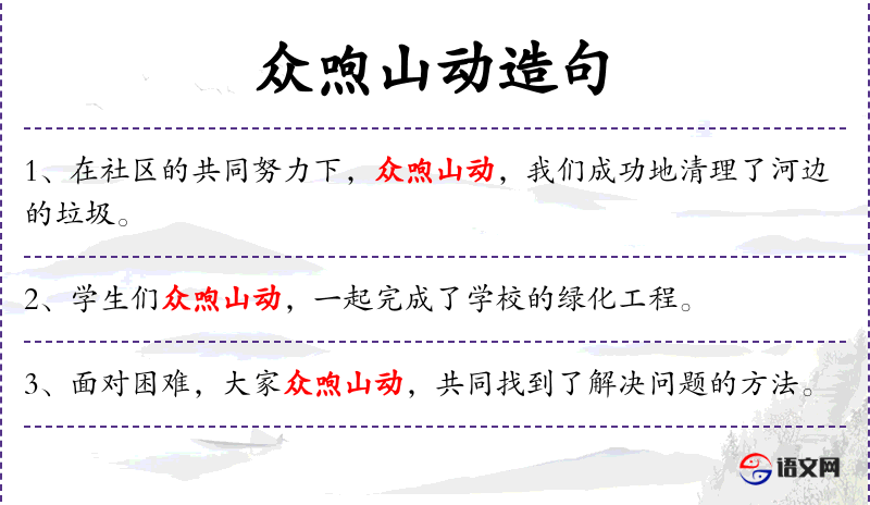 - 成语典故:“众喣山动”源自《左传·僖公二十六年》,原意是指众人的力量可以移动山岳。