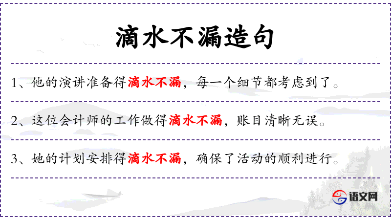 2. 【滴水不漏】 - 一滴水也不外漏。形容说话、办事非常细致、周密,无懈可击。也形容钱财全部抓在手里,轻易不肯出手。
