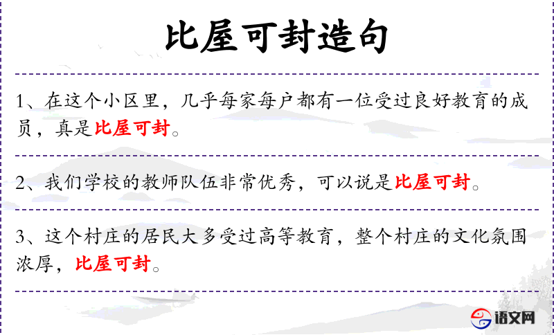 7. 【比屋可封】 意思是在唐、虞时代,贤人很多,差不多每家都有可受封爵的德行。后比喻社会安定,民俗淳朴。也形容教育感化的成就。