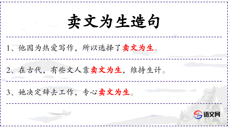 - 卖文为生:指以写作或文学创作为职业来维持生计。