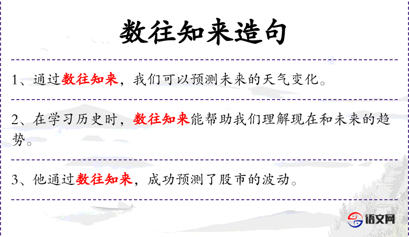 - 数往知来:这是一个成语,意思是根据过去的历史来推知未来的发展。