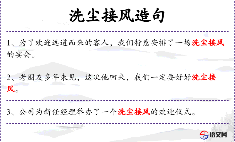 1. 【洗尘接风】 - 指设宴款待远来的客人,以示慰问和欢迎