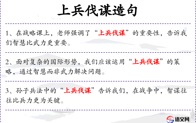1. 【上兵伐谋】 上:上等,引申为最好的。兵:指战争,引申为用兵。伐:讨伐,攻打。伐谋:用计谋粉碎敌人的计策。用兵的上策,是以谋略取胜。