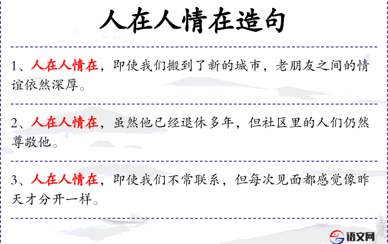 - 人在人情在:这是一个成语,意思是人在社会中,人际关系很重要。