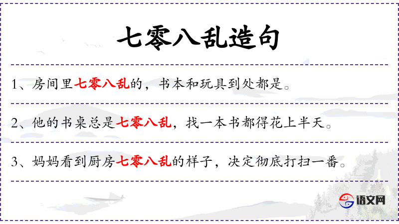 - 七零八乱:形容词短语,形容东西摆放得杂乱无章。