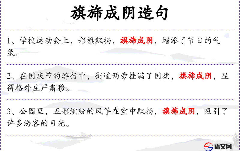 - 旗旆成阴:形容旗帜众多,形成一片阴影,比喻支持者众多。