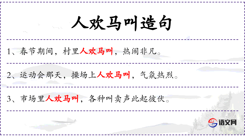 - 人欢马叫:形容人们欢笑,场面热闹。其中,“人欢”指的是人们高兴,“马叫”在这里是比喻,表示场面热闹非凡。