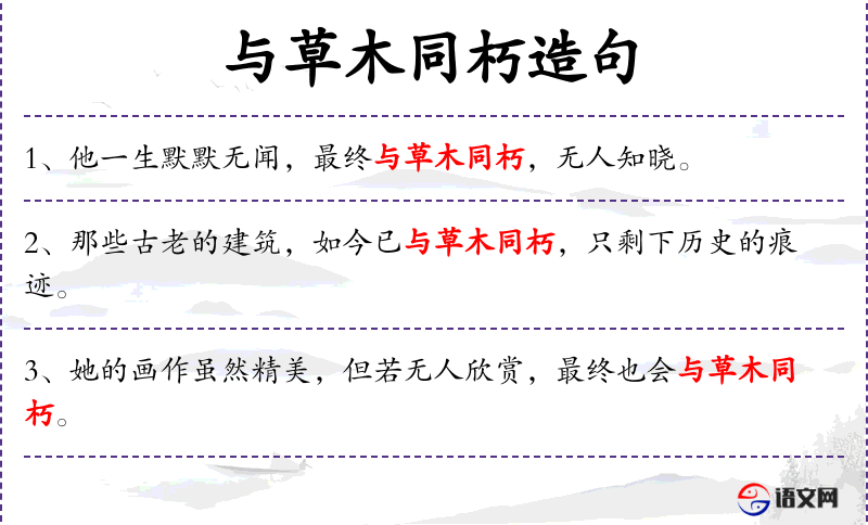 1. 【与草木同朽】 和草木一起腐烂。形容人生前无所作为,死后也默默无闻。
