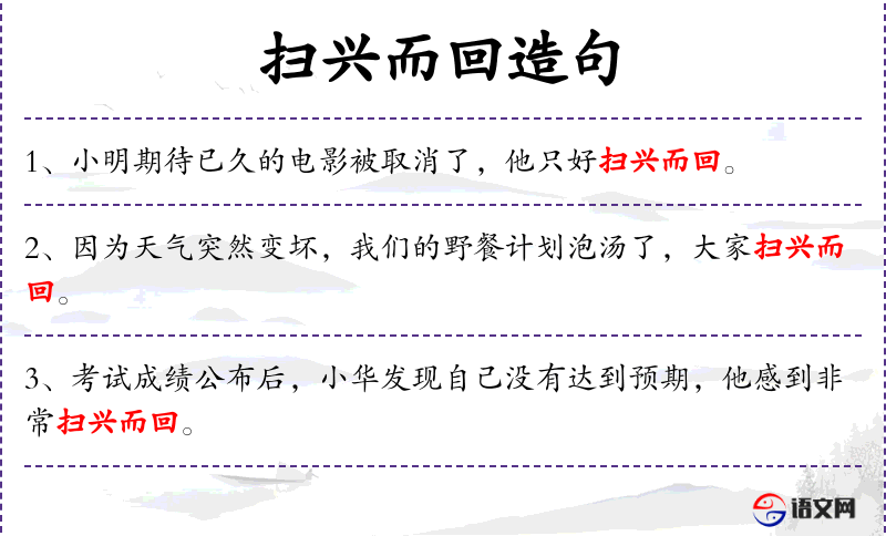 - 扫兴而回:动词短语,表示因为失望而回家。