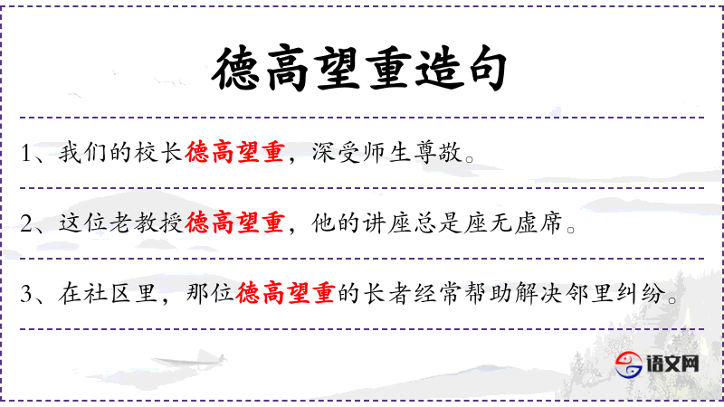 - 德高望重:形容一个人品德高尚,声望很高,受到人们的尊敬。