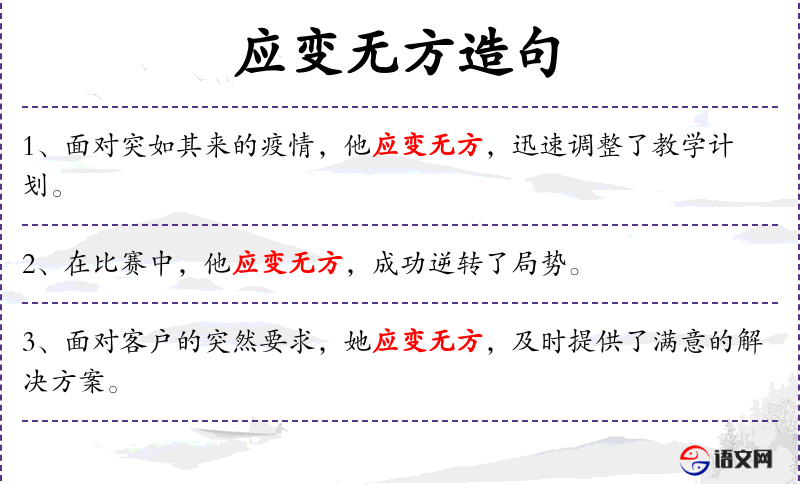 句子中的“应变无方”是一个成语,源自传统文化,强调在面对突发情况时的应对能力。这个成语的使用反映了人对应急处理能力的重视。