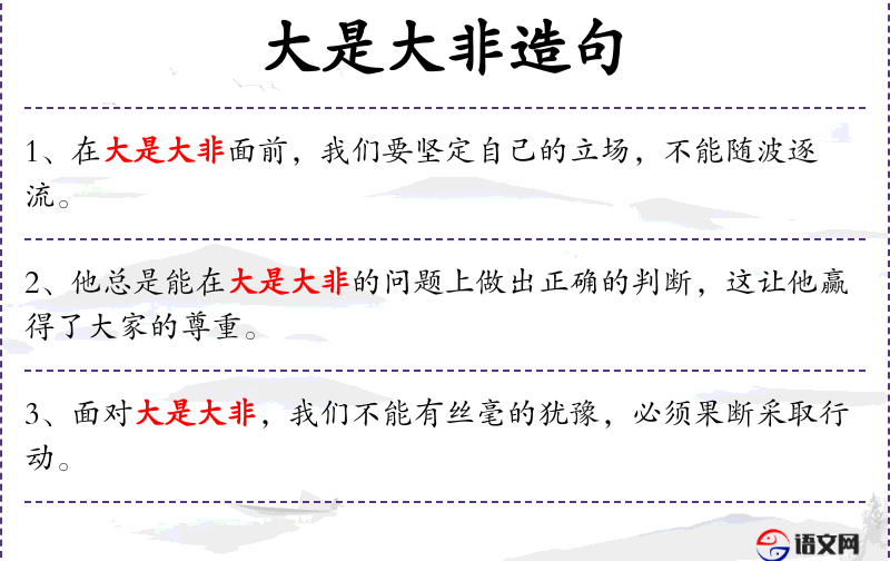 - 大是大非:指重大的、原则性的问题,特别是道德和政治上的正确与错误。