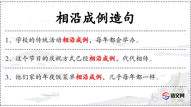 1. 【相沿成例】 - 依照相传下来的一套慢慢地成了示例。