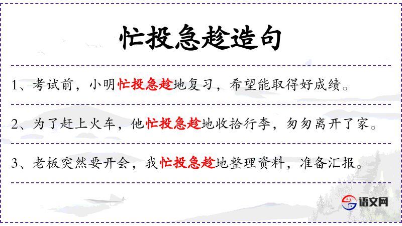 句子:“为了赶上火车,他忙投急趁地收拾行李,匆匆离开了家。”
