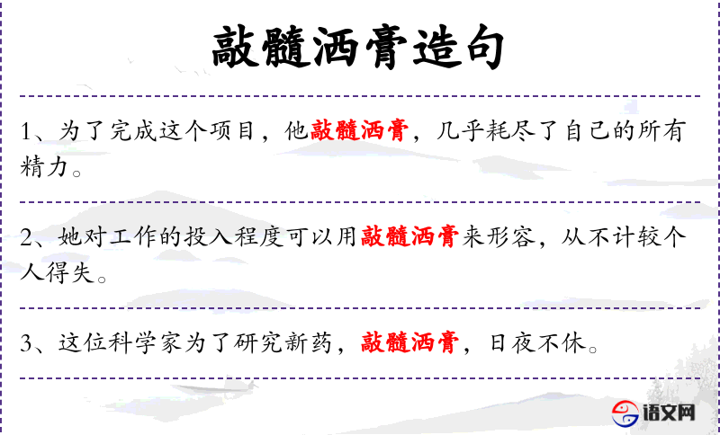- 敲髓洒膏:这是一个成语,形容非常勤奋、不遗余力地工作。