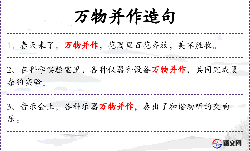 句子:“[音乐会上,各种乐器万物并作,奏出了和谐动听的交响乐。]”