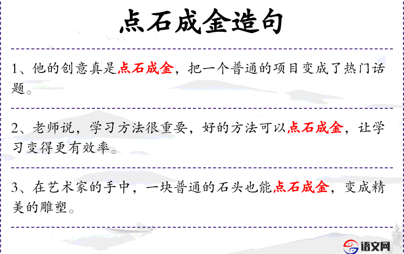 4. 【点石成金】 比喻修改文章时稍稍改动原来的文字,就使它变得很出色。