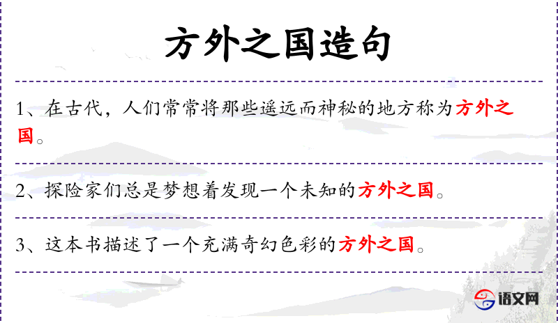 - 充满奇幻色彩的:形容词短语,修饰“方外之国”,强调其奇幻的特性。