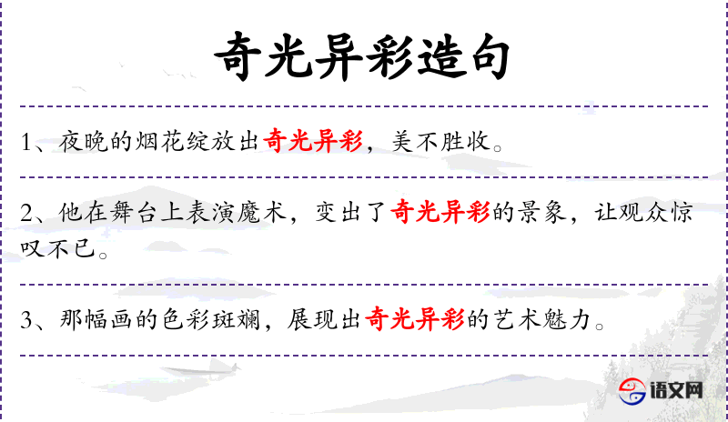 - 奇光异彩:形容光影效果非常美丽和独特。