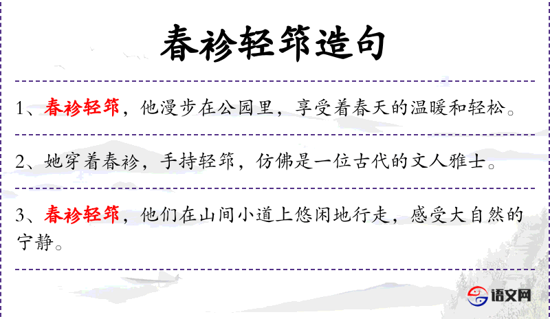 1. 【春袗轻筇】 袗:单衣;筇:竹子的一种,可做手杖。单衣轻杖。形容身体轻快。