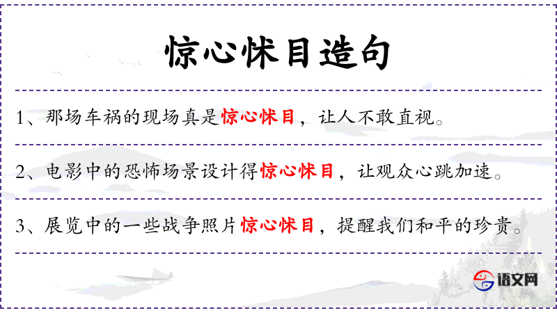 - 惊心怵目:形容景象或事物非常惊人,使人感到震惊和恐惧。