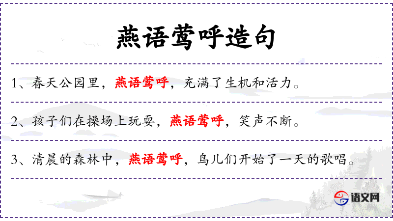 3. 【燕语莺呼】 - 莺:黄鹂。燕子的话语,黄鹂的歌声。形容春天里大好的景象。也比喻女子说话声音婉转动听。