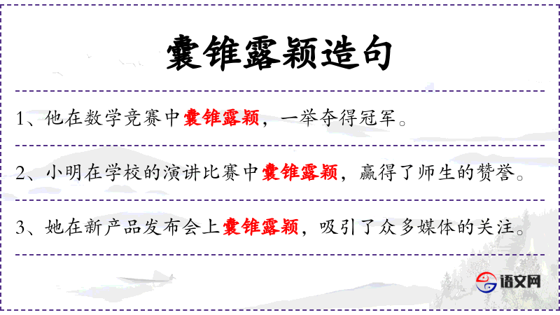 - 囊锥露颖:这个成语源自**古代,比喻人的才华或能力非常突出,能够在众人中脱颖而出。