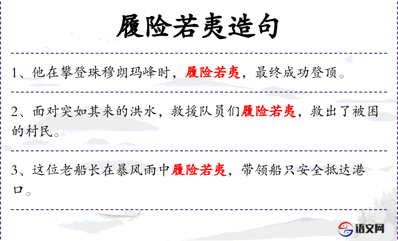 - 履险若夷:成语,意思是面对危险像走平地一样,形容非常勇敢或技艺高超。