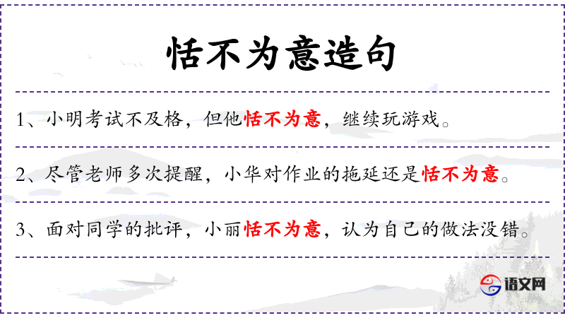 句子:“小明对同学的建议恬不为意,坚持自己的错误做法。”