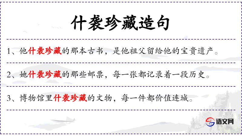 - 定语:“图书馆里什袭珍藏的”修饰“古籍”,说明古籍的存放地点和收藏状态。