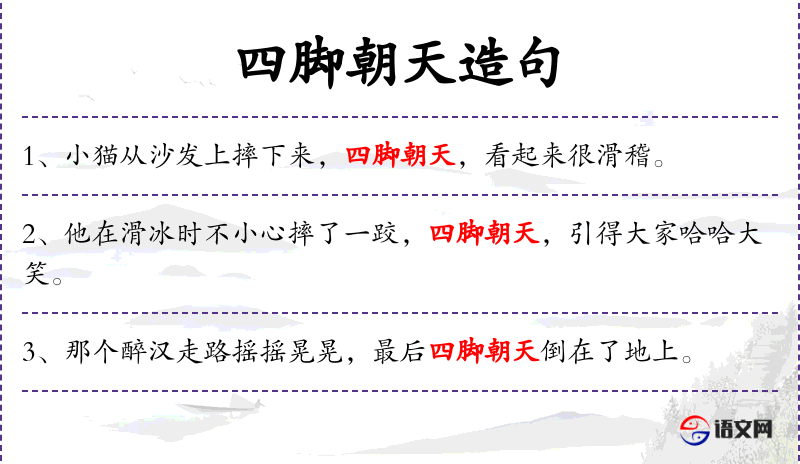 - 四脚朝天:形容人或动物跌倒后四肢朝上的样子,常用于夸张或幽默的语境。