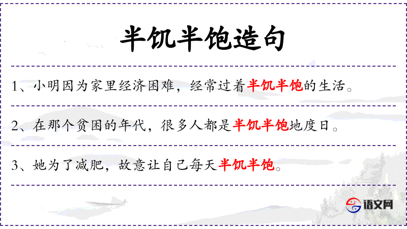 - 半饥半饱:形容词短语,描述饮食不充足的状态。