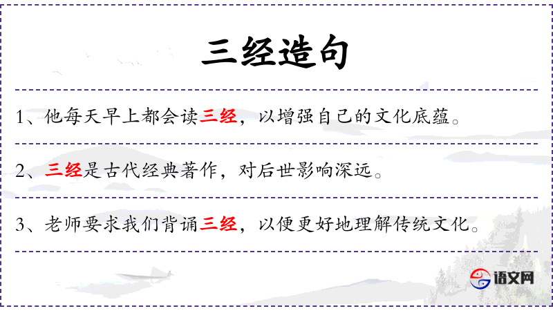 1. 【三经】 谓天时﹑地利﹑人和; 儒家的三部经书。指《易》﹑《诗》﹑《春秋》; 儒家的三部经书。指《诗》﹑《书》﹑《周礼》。王安石曾撰《毛诗义》﹑《尚书义》﹑《周官新义》,合称《三经新义》; 儒家的三部经书。指《孝经》﹑《论语》﹑《孟子》。《宋史.艺文志一》有刘元刚《三经演义》,清黄丕烈辑《三经音义》,均指上述三书; 指《诗》六义中的赋﹑比﹑兴。《朱子语类》卷八十"三经是赋﹑比﹑兴,是做诗底骨子。"一说指《风》﹑《雅》﹑《颂》。