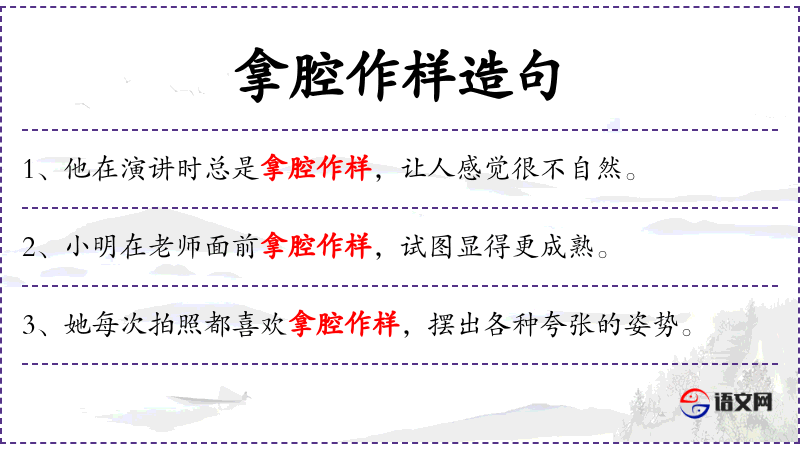 - 拿腔作样:成语,指故意装出某种样子或态度。