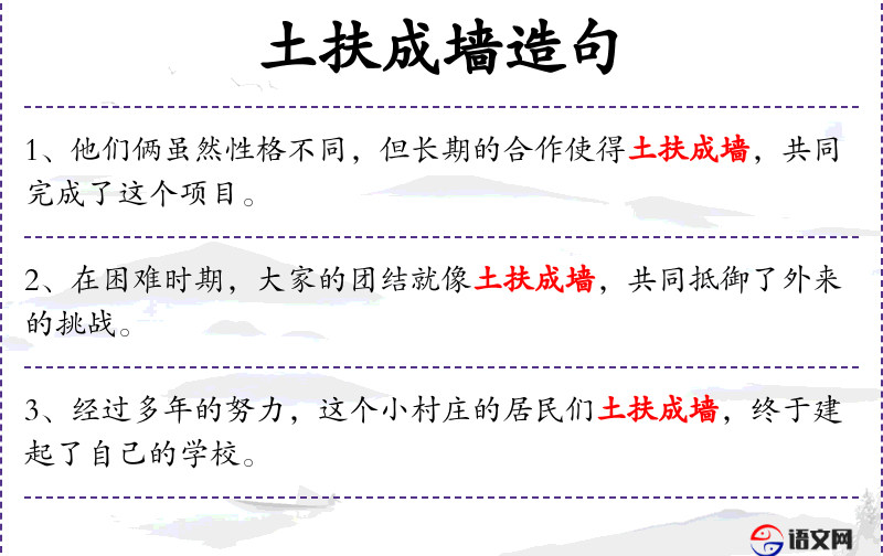 - 土扶成墙:成语,比喻基础虽*弱但经过努力可以变得坚固。